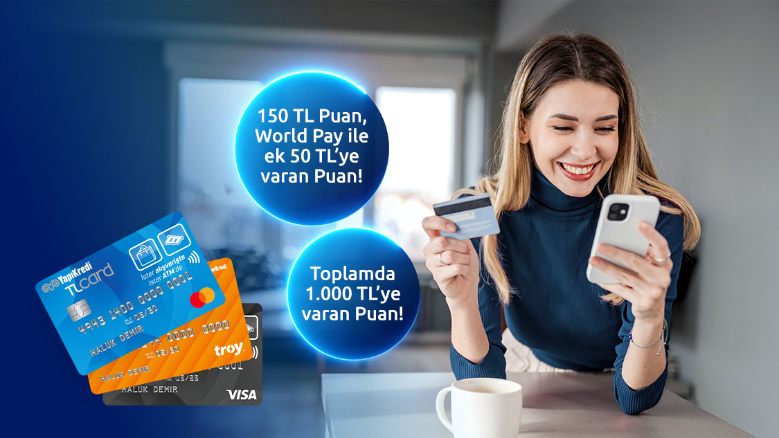 6-30 Nisan 2026 tarihleri arasında bireysel TLcard’larla Amazon.com.tr, Dolap.com, Hepsiburada, Idefix, Pazarama, Trendyol, Trendyol Milla web site ve mobil uygulamalarından yapacağınız her 2.000 TL ve üzeri alışverişinize 150 TL , World Pay ile ödemelerde ek 50 TL, toplamda 1.000 TL’ye varan Puan hediye!
